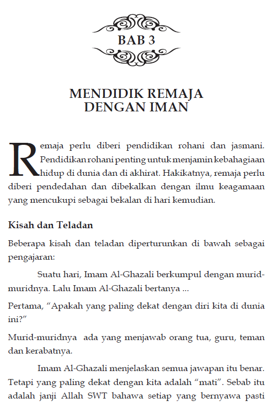 “Dan jika niat dan tujuan antaramu dengan Allah dalam mencari ilmu, adalah untuk mencapai hidayah, bukan semata-mata bermegah dengan riwayat, maka bergembiralah, kerana sesungguhnya para malaikat melebarkan sayapnya ketika kamu berjalan, dan hidupan di laut mendoakan keampunan bagimu dalam setiap langkahmu.” Dengan kata-kata tersebut , remaja janganlah sesekali mencari ilmu kerana inginkan kemegahan, kemewahan mahupun pangkat semata-mata kerana semua itu hanyalah membawa kecelakaan kepada remaja semua.